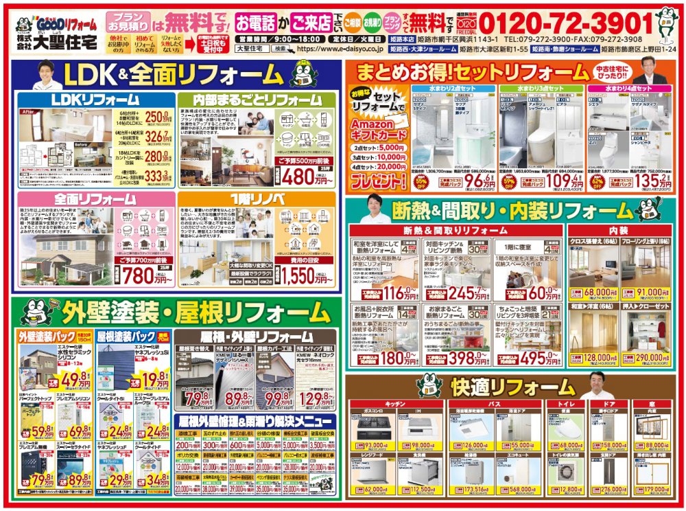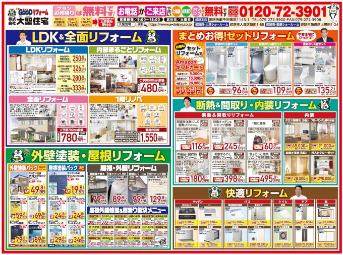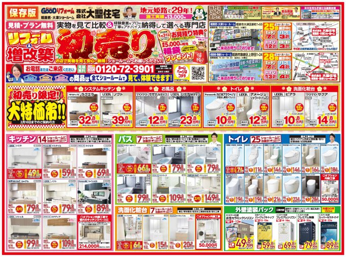 姫路市リフォーム//リフォーム 姫路市//キッチンリフォーム//お風呂リフォーム//姫路 キッチン//リフォーム トイレ//和室 リフォーム//洋室 リフォーム//LDKリフォーム//姫路市リフォーム会社//リフォーム会社//大聖住宅//姫路 GOODリフォーム//バスリフォーム//洗面台リフォーム//姫路市//姫路 修理//姫路 下水道工事//リフォーム 口コミ//姫路 リフォーム 見積もり//姫路 見積もり//姫路市 リフォーム//無料 姫路 見積もり リフォーム//改装//住宅改修//新築//増改築//内装//カーテン//ブラインド//塗装//畳//たたみ//タタミ//フローリング//電気工事//オール電化//エコキュート//エコフィール//ガス給湯器//お風呂 給湯器//大聖住宅//コイズミ//証明//水栓金具//水洗トイレ//便槽//浄化槽//給湯器//窓//扉//建具//塗料//自社職人//左官工//水道管//水道 お湯//壊れた//商品//SK//UB//タイル//お風呂//寒い//冷たい//安売り//%OFF//値下げ//展示現品//ショールーム//TOTO//ノーリツ//YKK//INAX//LIXIL//DIY//タカラ//クリナップ//三菱//パナソニック//ダイワ//簡易水洗//台所//外壁//屋根//塗装//暖かく//部品交換//急ぎ//姫路市内//GOODリフォームショールーム//