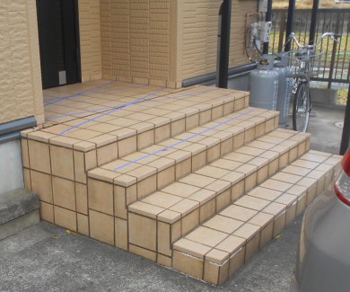 玄関ポーチの土間タイルが何カ所か割れており。補修にされるか、全面やり替えにされるか悩まれていました。ご予算のこともありますができれば玄関でもありますので(お家の顔)全面やり替えた方が良いのではありませんかとご提案させていただきました。今の風合いに近い色のプランと、今後のことも考えて雨でも滑りにくいタイルのプラン