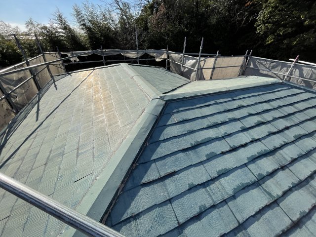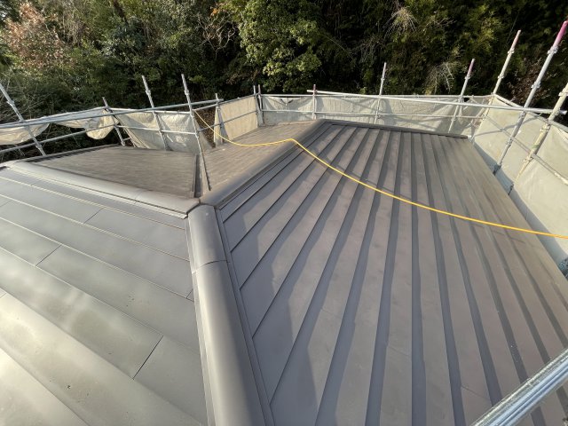 この度は大聖住宅に、ご依頼ご相談ありがとうございます。屋根の現状はカラーベストで、ひびが多く、色も褪せてしまい、表面も粉が出てきている状況でした。いつ雨漏りしてもおかしくないのではないかと言うような状況でした。今回ご提案させていただいたのが、太平産業のカレッセをご提案させていただきました。現在のカラーベストは年数的にもアスベストが入っていることもあり、解体、処分費用がかさんでしまうのでガルバニウム鋼鈑のカバー工法での工事内容とさせていただきました。耐用年数も長く、外観もきれいになりました。いつもお任せいただきまして本当にうれしく思います。ありがとうございました。また何かご不便ございましたらご相談ください。
