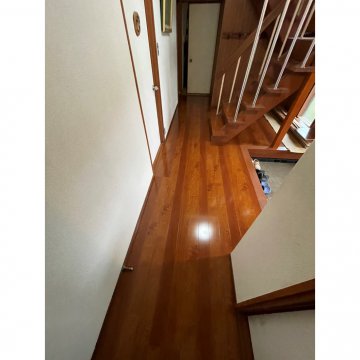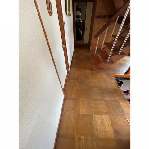 初めてお伺いしましたM様、築年数が20年以上あり床が結構傷んでいました。重ね貼りと貼り換えの選択肢の中で建具の取り合いを考えると離れは貼り換え、玄関は重ね貼りが一番良い収まりになると判断しご提案させていただきました。工事も順調に進み良い収まりに仕上がったと思います。今後ともよろしくお願いいたします。