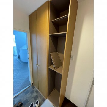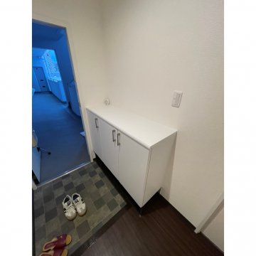 初めてお伺いしましたK様、トイレのドア以外にも廊下に面しているドアが全てSD枠になっておりほとんど全て内開きの設計でした。まずはSDを取り外して新たに外開きのドアを取り付けました。さらに玄関収納は下部にいくつか靴を置きたいとご要望をいただき、大工工事で玄関収納の下に台をつくりその中に靴が収納できるように設計してみました。