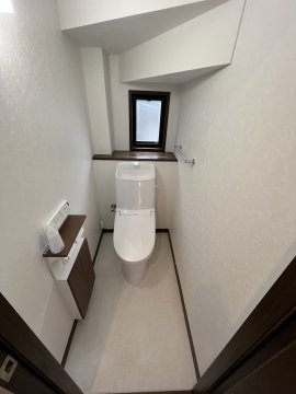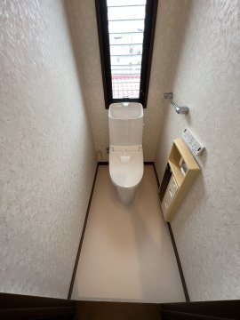 ご相談内容としましては、1階はトイレの取り換えと壁紙貼り換え、床もCF貼り換え、収納庫の取り換えです。2階はトイレ取り換えと床のCF貼り換え、洗面所は洗面化粧台の取り換えとサイド収納の取り換え、それと内装の貼り換え工事と言う内容でした。きっかけは1階のトイレから聞こえるシューと言う水の音と水道メーターが微量に回っていることがきっかけでした。水道代も少しづつですが上がってきていたので早めに直そうと考えられたそうです。商品としては、トイレはリクシルのアメージュシャワートイレを1階・2階のトイレともに取り換え、洗面化粧台はリクシルピアラをお選びいただきました。色もホワイトで合わせられ、明るくなりました。又いつでもご相談いただけたらと思います。ありがとうございました。