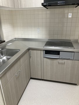 この度は大聖住宅にご相談、ご依頼ありがとうございます。T様のご自宅の現状としましては、築30年を超えているマンションでキッチンの形状はL型でした。そのキッチンの扉がめくれたり、建付けが悪くなったりしてしまっていました。扉タイプなので収納もしにくさがあるとの事でしたので、今回は引き出しタイプのシステムキッチンに取り換えをご提案させていただきました。IHやレンジフードはまだ年数も浅いので、現状の商品を再利用としました。又なにかご不便ございましたらいつでもご相談くださいませ。ありがとうございました。