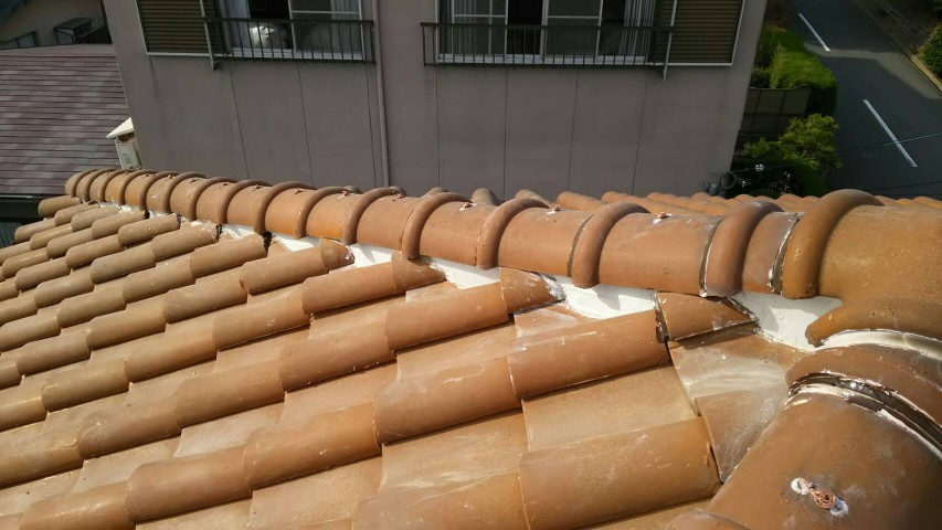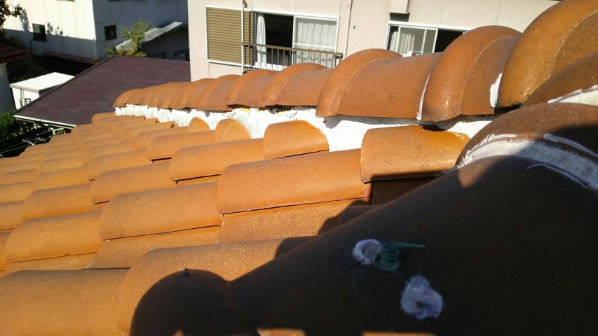 すでに応急処置で、大屋根の隅棟が歪んでいたのを戻して、漆喰を補修された後でした。