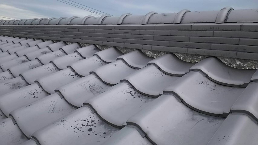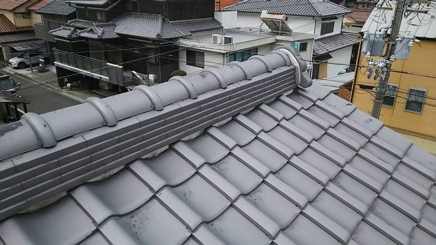 すぐにメンテナンスにお伺いしたところ、いぶし瓦の為、地上から見ると表面が少し剥げて黒く見えたところが浮いたように見えていました。