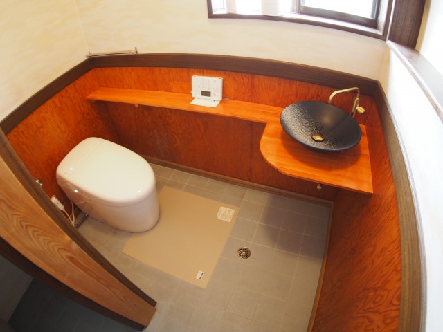 今回便器を取替るにあたり、最初はシステムの手洗い付きカウンターを考えておられたのですが、ご主人の和風の家に対しての思いがあり、手造りのカウンターと手洗器を付けたいという事でご相談を受けました。