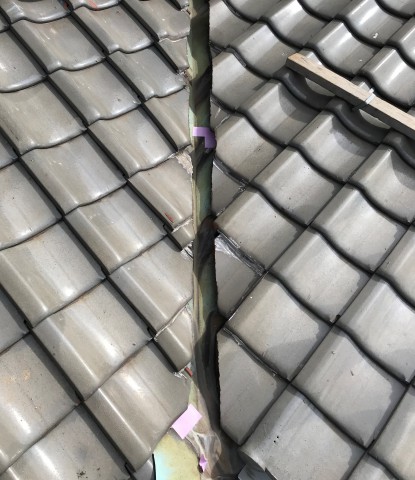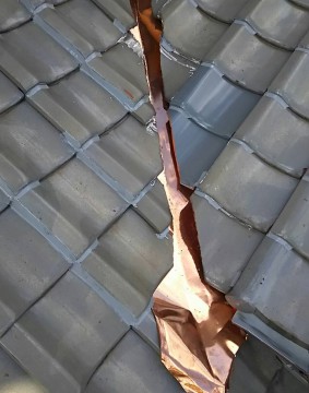 谷に敷いてある銅板は昨今の酸性雨で、瓦からしずくの落ちる場所に穴が開いてしまっていました。