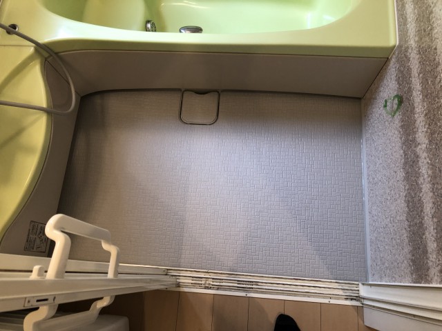 浴室のお掃除屋さんもお手上げで結局、浴室用床シートを既設床の上に貼る事にしました。浴室専用シートなので安心して使用、お手入れして頂けます。