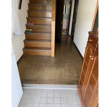 初めてお伺いした時に廊下の床がかなり傷んでいて、これはただ事ではないと感じました。まずは漏水チェック、水道メーターをチェックしコマが回転していないことを確認。これで給水側からの漏水でないことが分かりました。次に床下に潜らせて頂き原因を確認するとトイレの排水廻りの断熱材がべっとり濡れており、原因はトイレの排水からだとわかりました。傷んだ床、及び下地の根太、断熱材の交換と床の仕上げ及びトイレと脱衣室は壁天井のクロスの張替えを行いました。。また1ヶ月点検では床下から点検させて頂きますのでよろしくお願いいたします