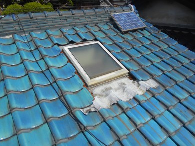 お家内部の雨漏り箇所の確認、その後屋根の上に上がり再度点検すると原因が見えてきました。まず原因の1つ目は使われていない天窓、ここの板金部分が腐食してきており悪さをしています。もう一つは谷樋、銅板でできている谷樋は酸性雨の影響で傷みだしています。この2つを解決してあげれば雨漏りは直ります。