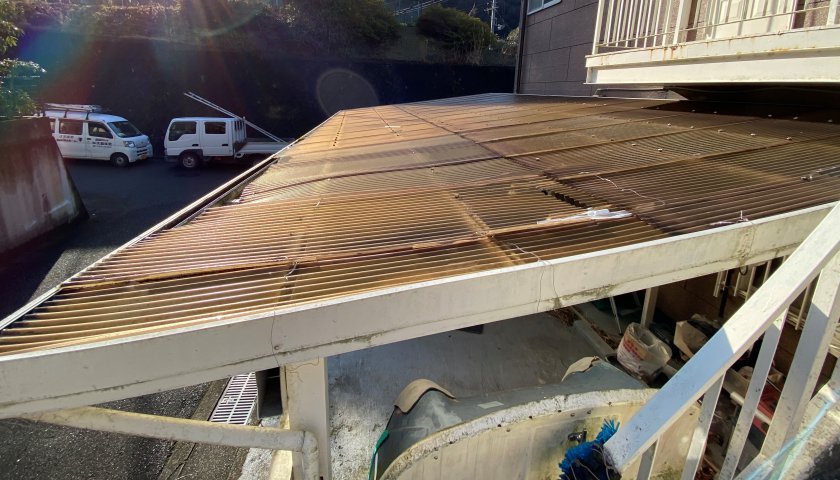 初めてお伺いしましたN様。カーポートの波板の借り換え、外壁のウェザーカバーの交換、屋上のテラスの解体とヒビの補修といろんな工事をさせていただきました。