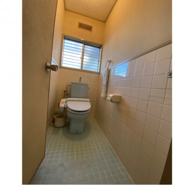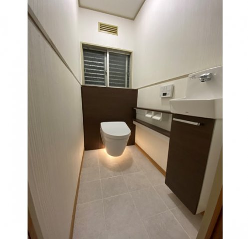 洗面化粧台はLIXILピアラで、ホワイトの2段引き出しが綺麗に収まっていて洗濯機との並びで脱衣場の空間も変わりました。そして最後はトイレです。息子様の拘りが強くあった場所で、既設のタイルを解体して内装、床、天井と張り替え、背面に収納棚を含めた手洗い器付きのTOTOレストパルF型シリーズです。仕上がりのイメージとお客様のイメージがぴったりはまり、非常に喜ばれていました。またハイグレードのトイレではありますが、お手入れもしやすい仕様になっています。それもお母様の為にとの思いからでした。