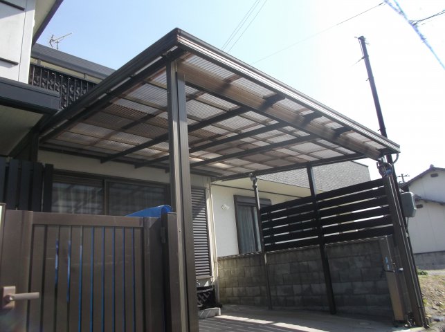 ご連絡頂き、ご自宅までお伺いさせて頂きました。点検させて頂き、両端のビスが無くなっていて風が吹く度、いつ剥がれてもおかしくない状況でした。早急に対応させて頂きました。既存のお色からブロンズ色の雰囲気も変え、また遮熱性の波板に替えました。ビスも全て新しく変え非常に綺麗になったと思います。