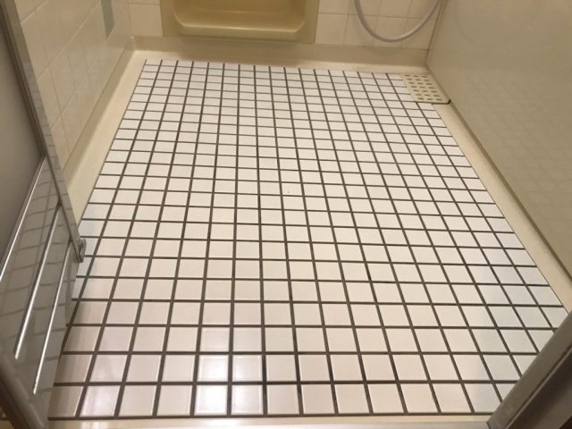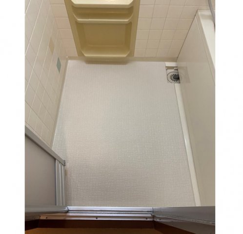 ご連絡頂き、早急にお伺いさせて頂きました。冬場の浴室の床が寒い為、弊社の事例も含めいくつかご提案させて頂きました。浴室に入る際に感じる寒さを少しでも軽減するにあたり、上から浴室用フロアーシートを新貼りする施工を行いました。見た目も感触もユニットバスフロアーの床同等の仕上がりです。
