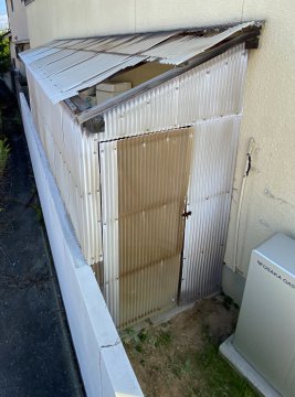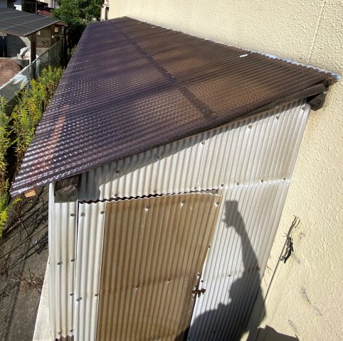 先日の強風で物置の波板がめくれてしまい、パタパタと結構音がうるさいので張り替えをお願いしました。
