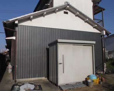 今回は、玄関幕板の木製部分の口が開いてきて雨が入る状況になっていましたので。板金のカバー工法でお手入れするとともに、西側の外壁の波板板金の張り替え工事をさせていただきました。玄関は年数なりにかなり傷んでおりましたがなんとか格好がつきました。外壁の波板の張り替えも下地の痛んでいるところは補強して張り替え完了いたしました。