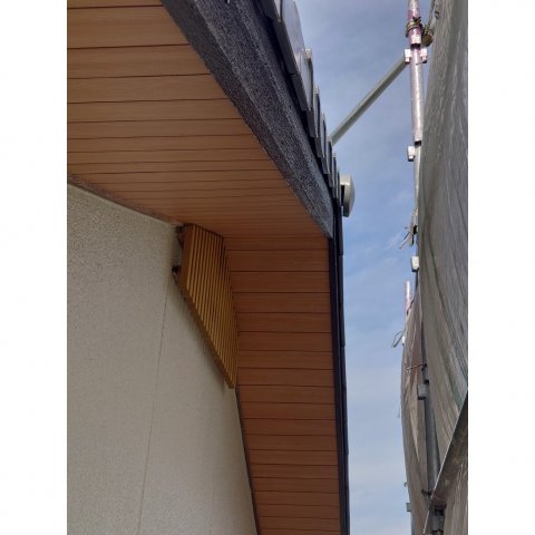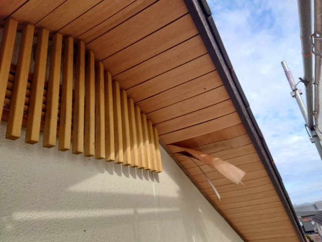 この度は大聖住宅に、ご依頼ご相談ありがとうございます。会社からも近く、昔から大聖住宅の事を知っていただいていたとお聞きしました。そして今回ご相談いただけてご期待に添えれる事が出来うれしく思います。今回S様の現状は軒天のピーリングがめくれ落ちかけている状況でした。強い、雨風にあおられて今にも飛んで行ってしまいそうな状況になっていました。部分的の工事も考慮しましたがせっかくするならと全体的に貼替する工事内容をご選択いただきました。軒天以外にも細かな内容もお任せいただきました。ありがとうございました。