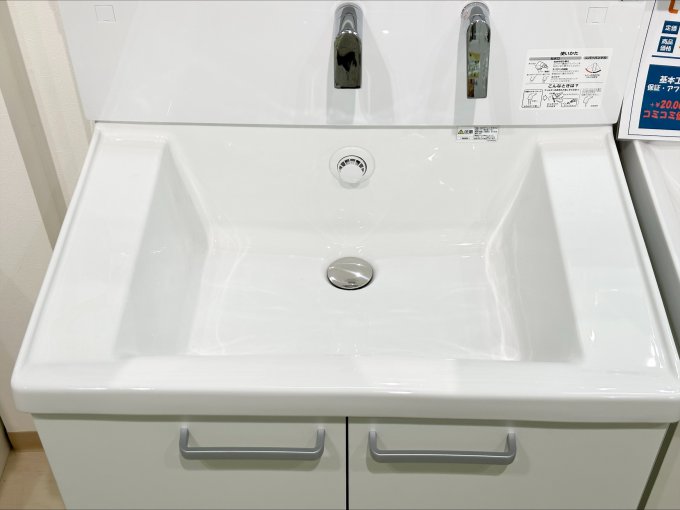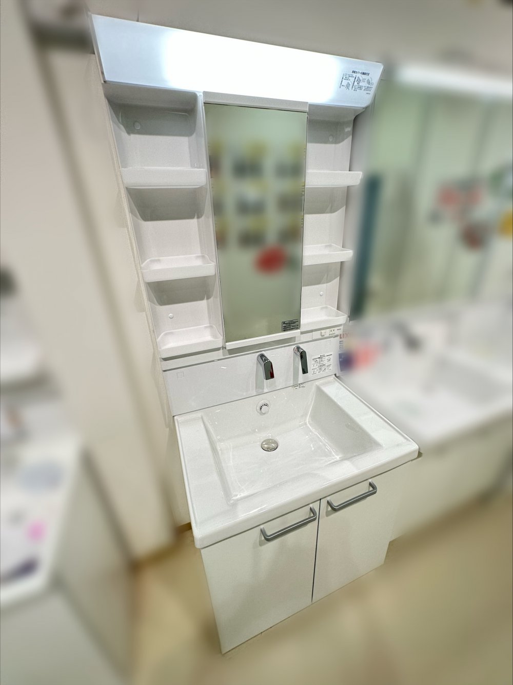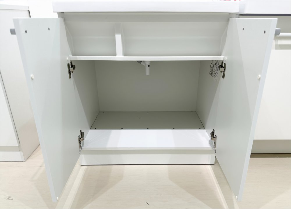 従来の洗面化粧台は排水管の関係で収納スペースが縮小されていましたが、この奥ひろ収納「奥ひろし」は配管の形をスマートにし、収納スペースを広げたため収納力がアップしています。