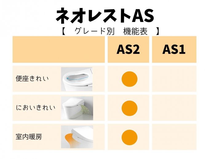AS2には、共通機能に加えて、トイレ使用後に便座裏先端まできれい除菌水を吹きかけ漂白・除菌をする〈便座きれい〉やトイレのにおいを自動で脱臭する〈においきれい〉、さらに温風でトイレ室内をあたためる〈室内暖房〉も搭載しています。
